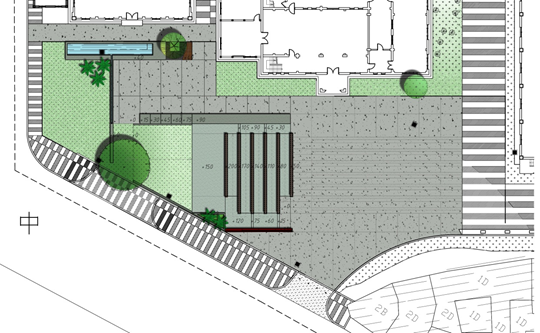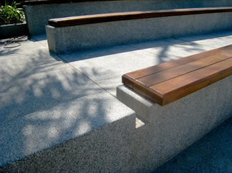 大面積露骨材地坪,樸素而具有歷史的質感,適合戶外戲劇、樂團表演等活動舉辦,廣場設計觀眾看台,巧妙的將斜坡與走道空間結合,塊狀看台的細部設計結合機能及設計感,深色鐵木座椅、抿石子質感,沉穩而融入環境。