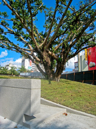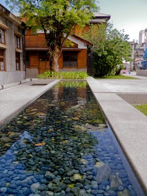 側面臨中華路之入口造型告示牆,上方原色鋼構框背披炭紋原木板,下方牆面斬石子混凝土質感,並以古老的手斬工法,將文創園區的名稱刻於牆面配合夜間燈光效果,大氣而簡約地體現文創園區入口意象。看台後方老榕樹草坡,鄰池畔寬厚的天然湧泉水池,樹蔭湧泉、沁涼舒適,鄰伴4棟a-zone咖啡香,可暫歇小憩。